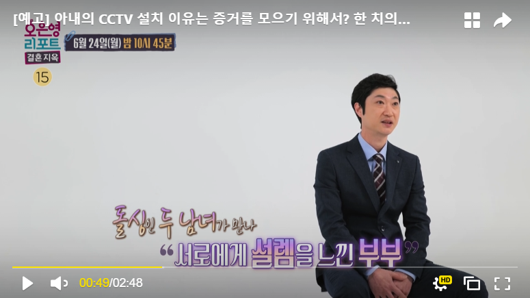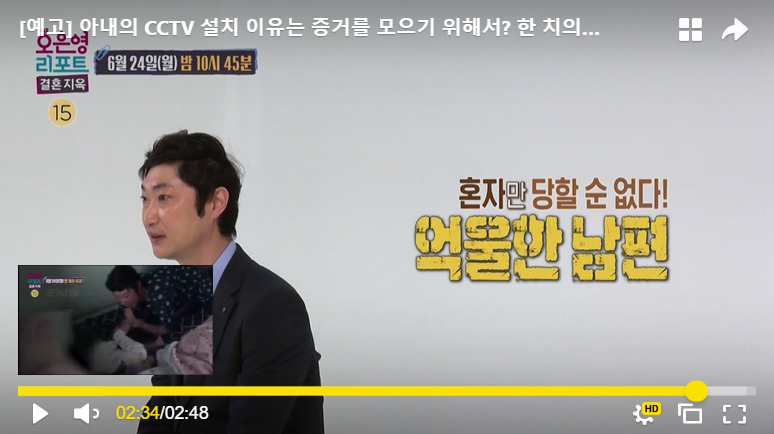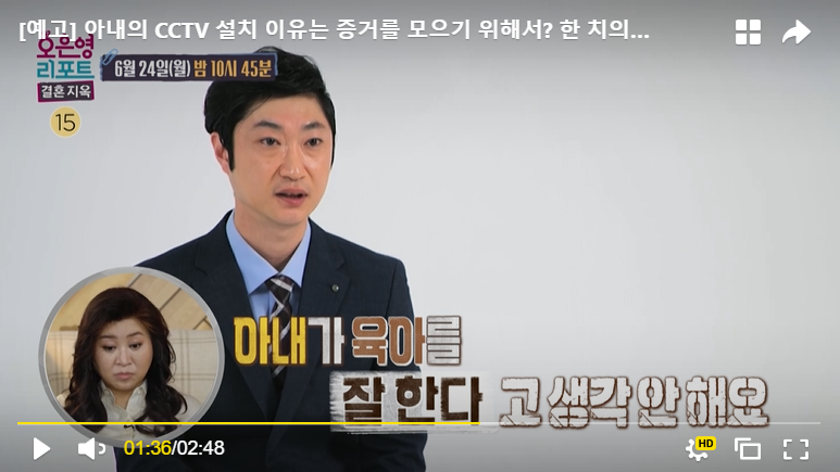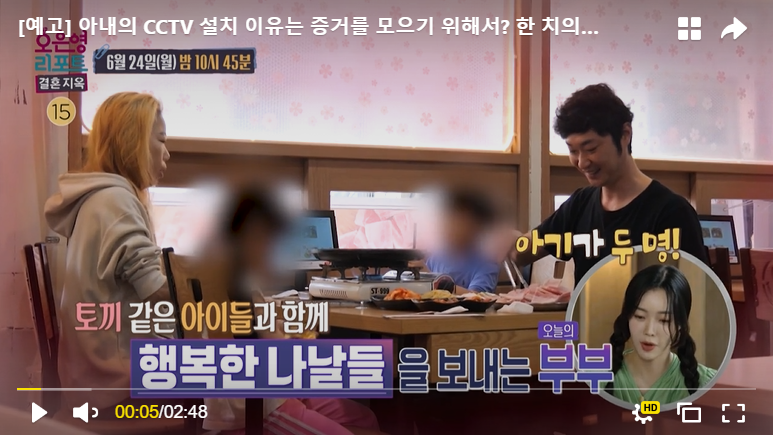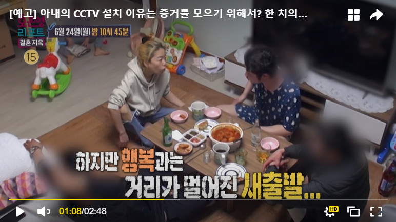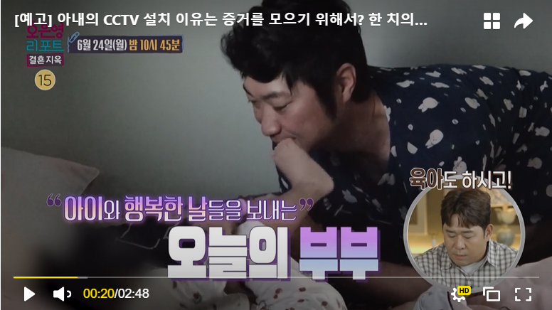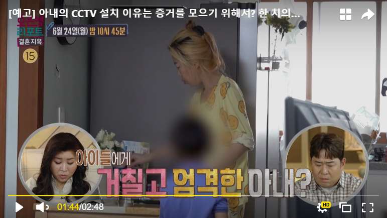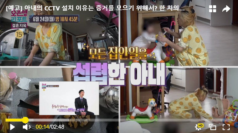 초반에 화면에서는 아내분이 집안일이며 육아며 열심히 하고, 남편분은 육아는 전혀 신경을 안 쓰는 상황으로 보였지만, 문제는 서로가 가정 폭력을 의심하면서 집에 각자가 CCTV를 설치한 상황이었습니다. 서로를 믿지 못하고 각자 아이들에게 행해지는 가정폭력에 대한 증거만을 잡겠다는 생각을 가지고 있었습니다.
