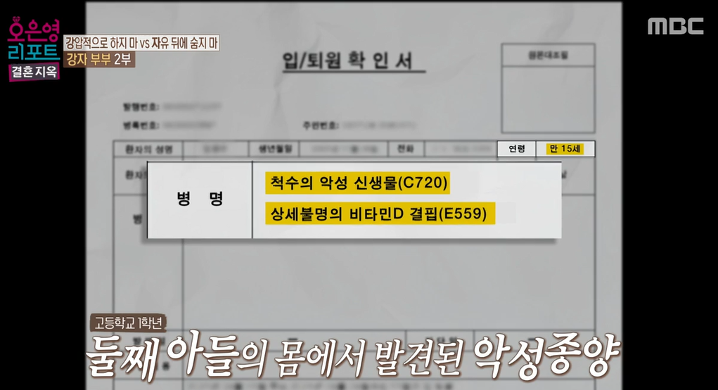 둘째 아들이 가장 절망적인 순간은 아빠가 집을 나갔을 때라고 합니다. 아들은 중3 때부터 심각한 허리 통증을 느끼기 시작합니다. 종양이 척수를 누르면서 동반되었던 신체 마비 증상과 통증들이 아이를 힘들게 했습니다학교에서는 학교 폭력에 시달리고, 몸은 극심한 허리통증을 느끼면서, 주변에 도와줄 어른이 없었다는 것이 가장 절망적이었다고 합니다. 그러나 이때 아내는 남편을 아들과 잠시 떨어뜨려 놓습니다. 아들이 자꾸 버릇이 나빠지니까, 남편에게 아들 연락 자체를 받지 말도록 시킵니다