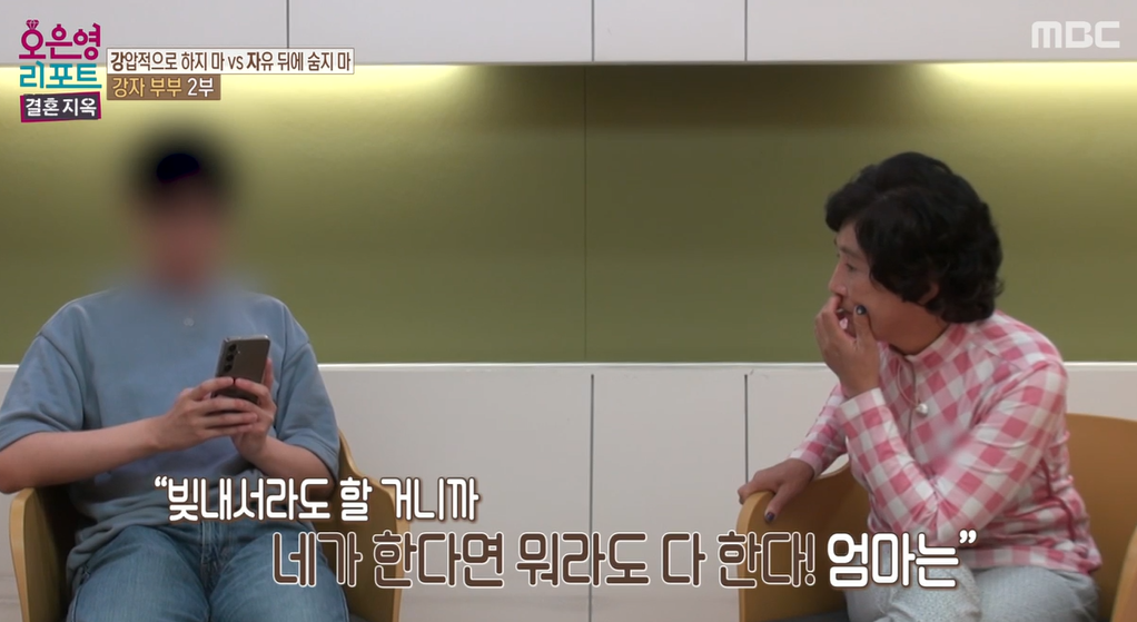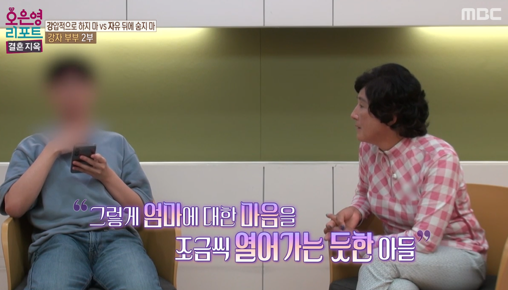 아들은 방송에 나와서 따로 모니터를 하는 방에서 방송 내용을 보고 있었습니다. 다만 상담 내내 문제가 뭔지 전혀 이해하지 못하는 엄마의 모습을 보면서 많이 답답함을 나타냅니다. 이에 오은영 박사의 설득으로 가까스로 방송에 직접 참여하게 되었습니다.