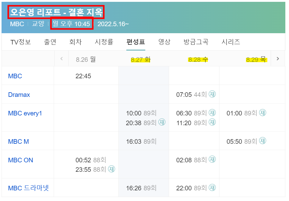TV 프로 재방송은 아래 편성표를 참고하시고, ott 프로그램은 웨이브를 통해서 시청가능합니다.