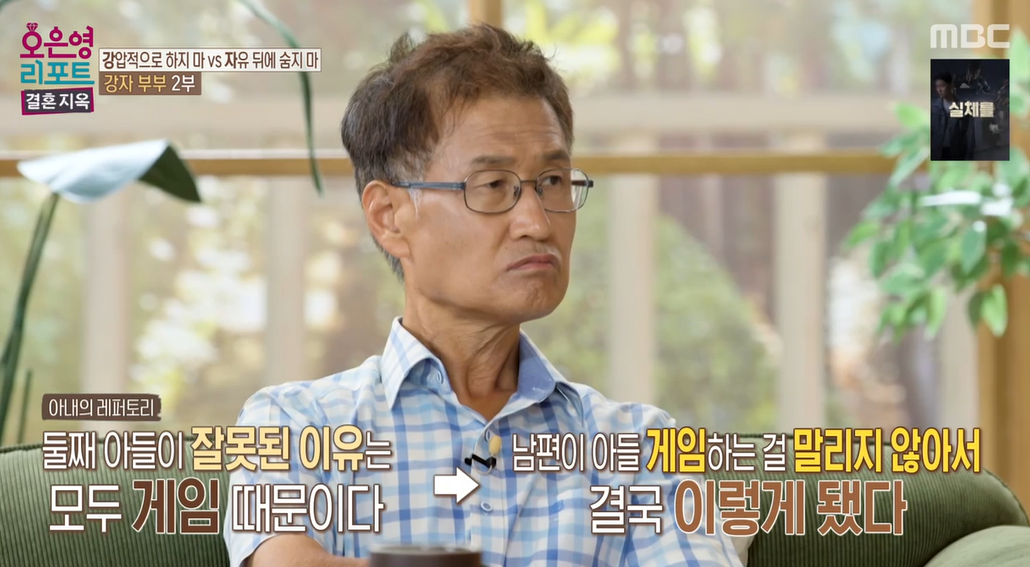 여기서 오은영 박사는 아내가 계속해서 말하는 레퍼토리에 대해서 얘기를 합니다. 아내는 계속해서 얘기를 합니다. '둘째 아들이 잘못된 이유는 게임 때문이다. 아들이 계속해서 게임하는 것을 남편이 말리지 않아서 결국 이렇게 됐다'는 얘기만 반복했습니다. 이웃과 대화를 할 때도, 남편과 다툴 때도, 제작진과 사전 인터뷰를 할 때도, 방송에 직접 출연을 해서도 계속 동일한 얘기를 반복하고 있었습니다.