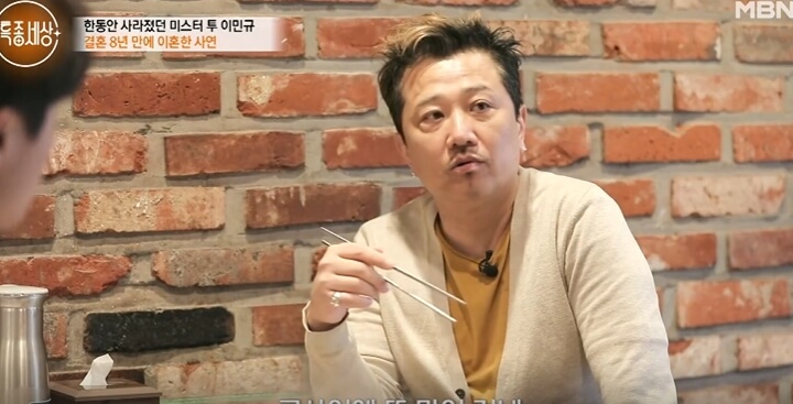 이민규는 방송을 통해 이혼 사실을 고백했다. “결혼 8년 만에 이혼했다”는 그는 혼자 사는 집을 공개하며 이별의 아픔을 이야기했다. 그가 털어놓은 이혼의 원인은 단순히 부부 간의 문제가 아닌 장인 장모와의 갈등에서 비롯된 것이라고 밝혔다. 결혼 생활 내내 쌓여왔던 감정의 골이 시간이 지나면서 점점 깊어졌고, 결국 극복하지 못한 채 이혼이라는 결론에 이르게 되었다고 전했다.